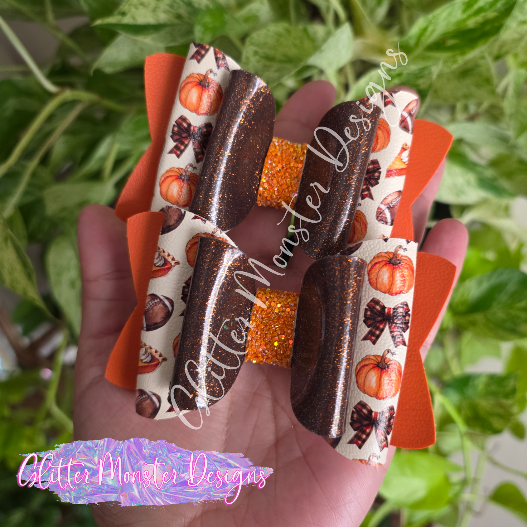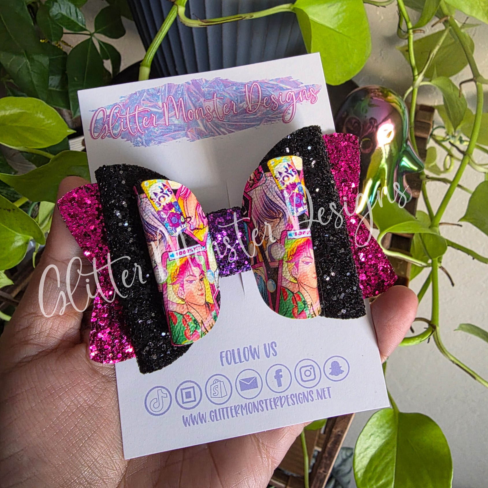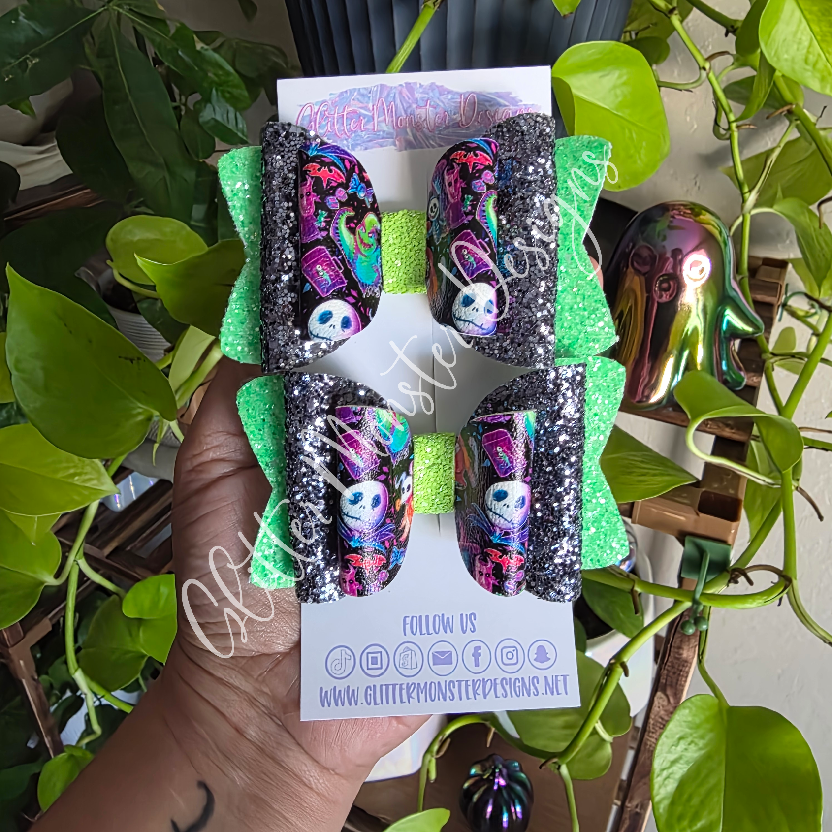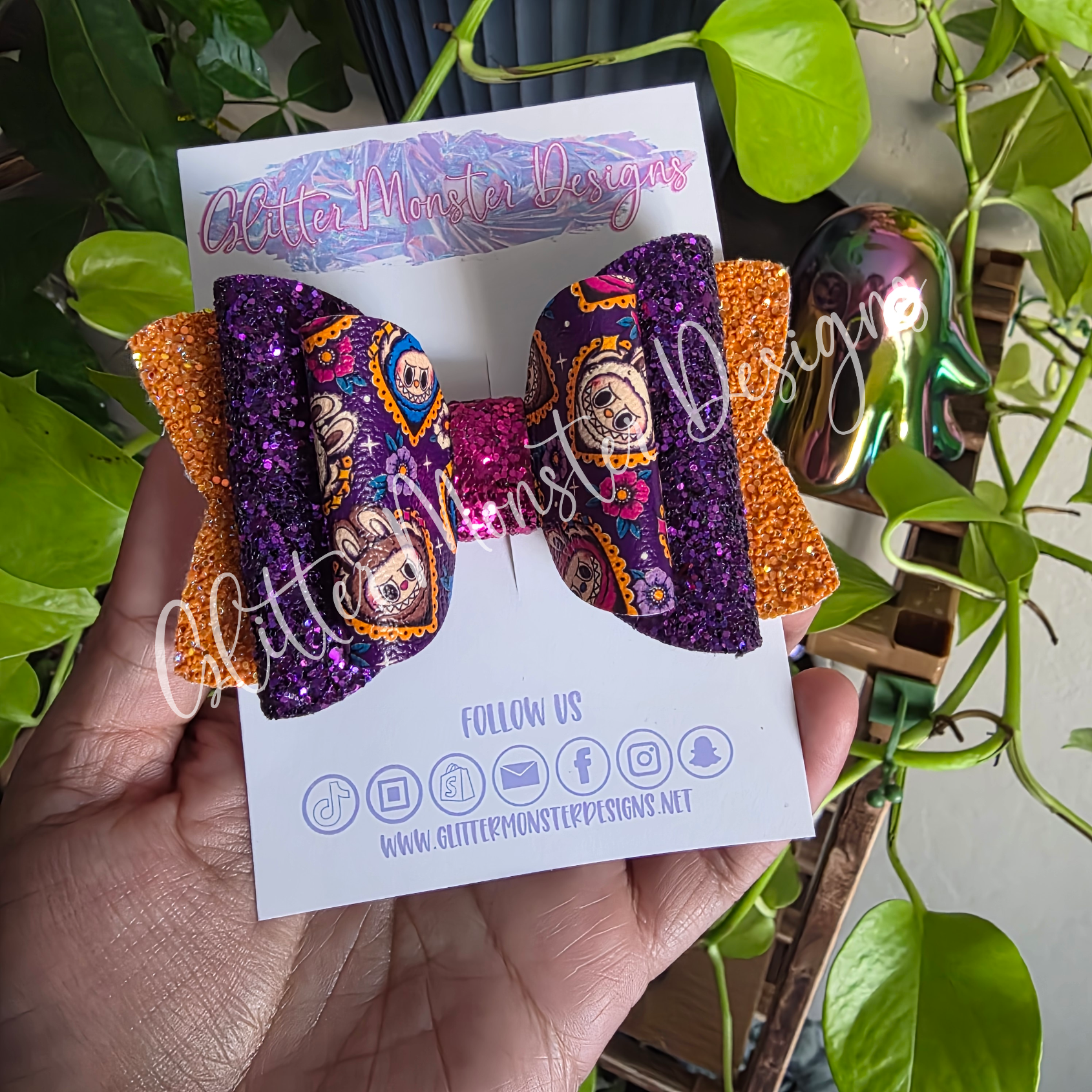 These double stacked 4" bows are one of our best sellers! Not only are the cute, fun, and mostly glitter. They are a little bigger, height wise then the single stacked and if you like extra sparkle. Then these are PERFECT! They are 4" wide from tail to tail, on an alligator clip. With teeth, and very durable!